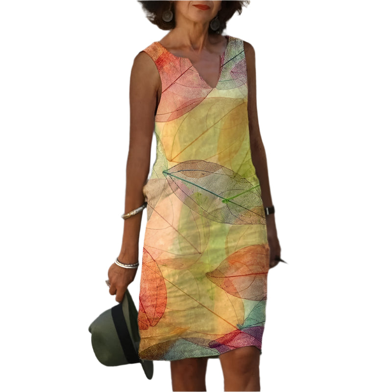Met een mouwloos ontwerp en een subtiele V-hals, biedt deze jurk een vleugje verfijning. Geschikt voor zowel casual als formele gelegenheden, is het een veelzijdige aanvulling op je garderobe. De levendige bladerenprint omarmt de warmte en charme van de herfst, waardoor je met elke draagbeurt opvalt.
