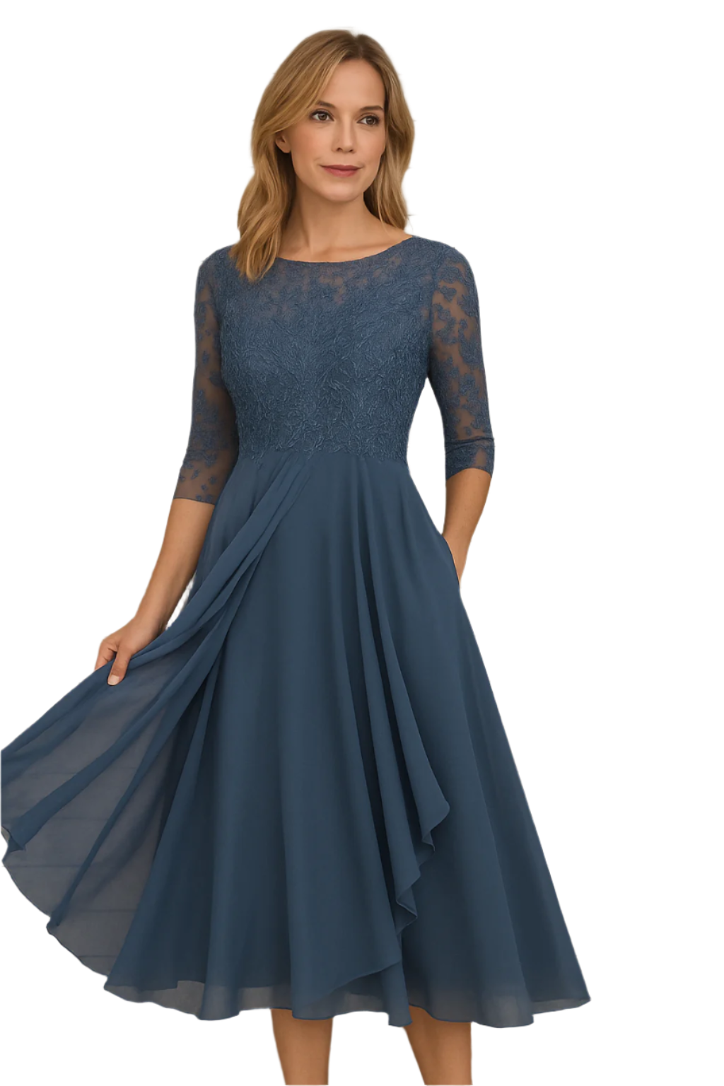 Deze jurk is ontworpen met een subtiele A-lijn en een zwierige asymmetrische rok die een speelse flair toevoegt aan je look. De bovenkant is verfijnd afgewerkt met een semi-transparante kantstructuur en driekwartmouwen, wat een chique uitstraling geeft. De nauwsluitende lijfje accentueert je silhouet zonder ongemak, terwijl de rok elegant over je benen valt voor een luchtige uitstraling.