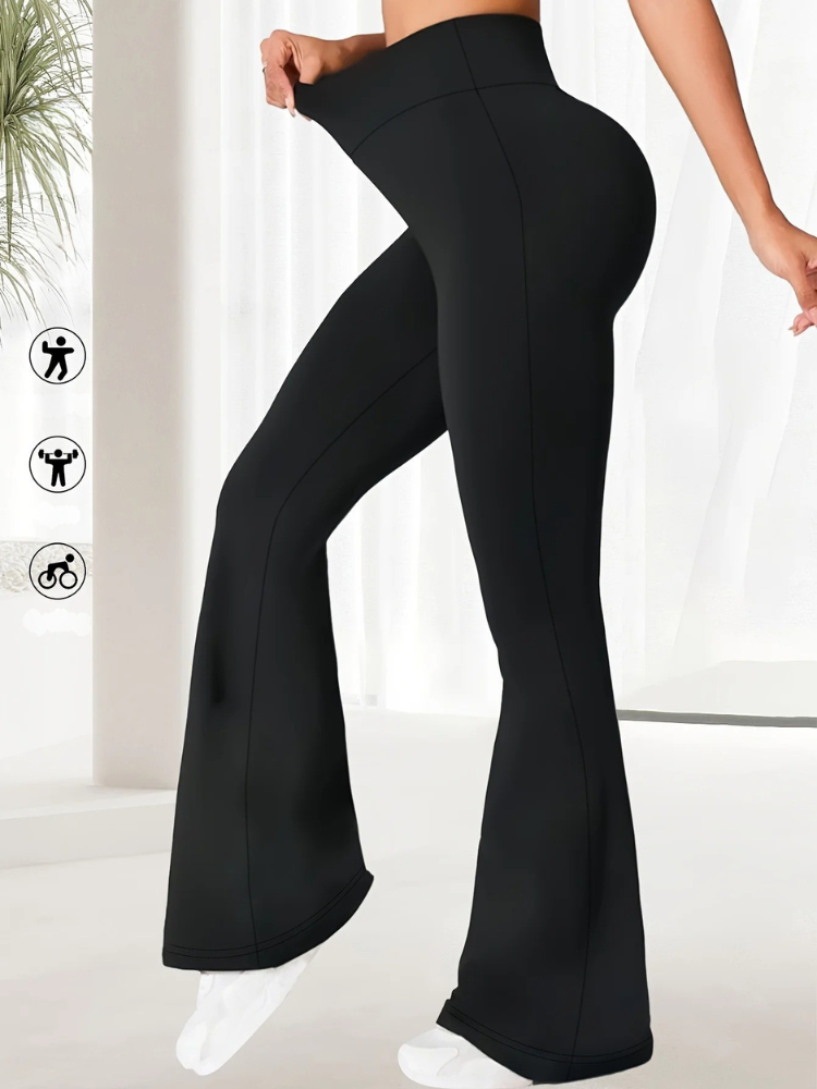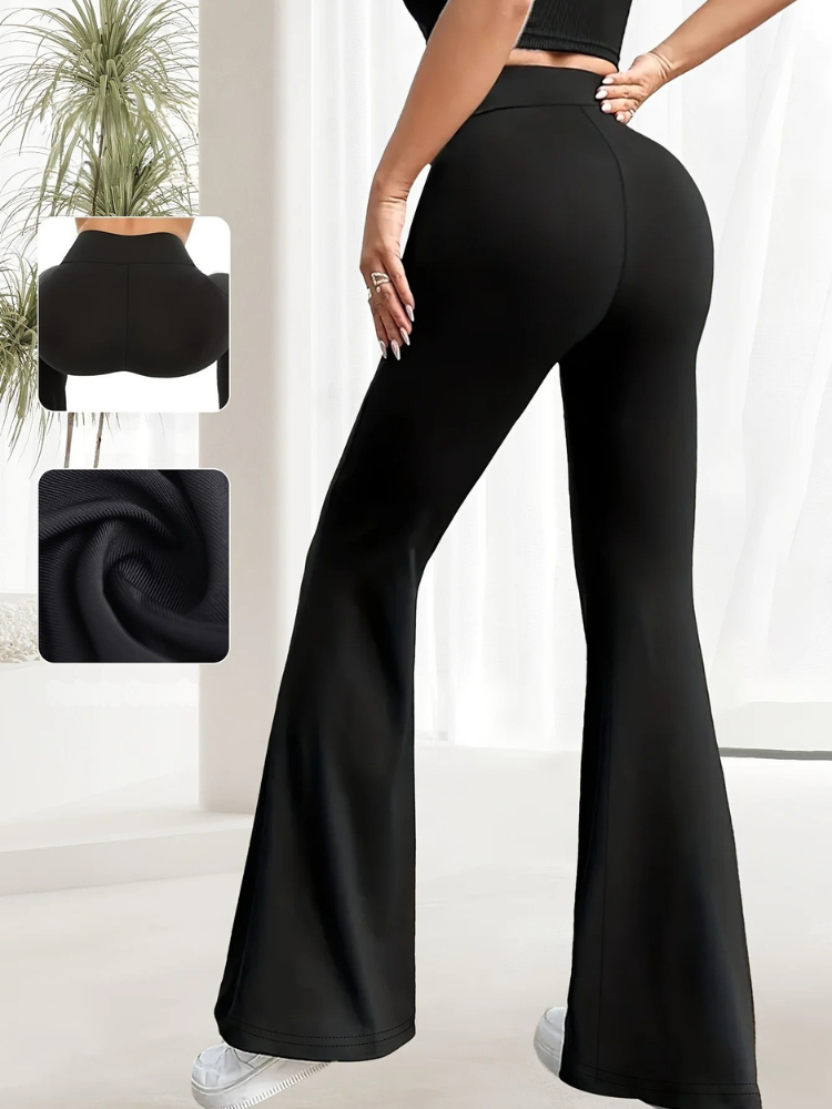 Deze flared broek voor dames heeft een hoge taille en een slim-fit bovenstuk dat overgaat in een elegante wijde pijp, voor een chique en langgerekt silhouet. De lichtgewicht, ademende stof zorgt voor een strakke look die ideaal is voor zowel casual als chique gelegenheden.