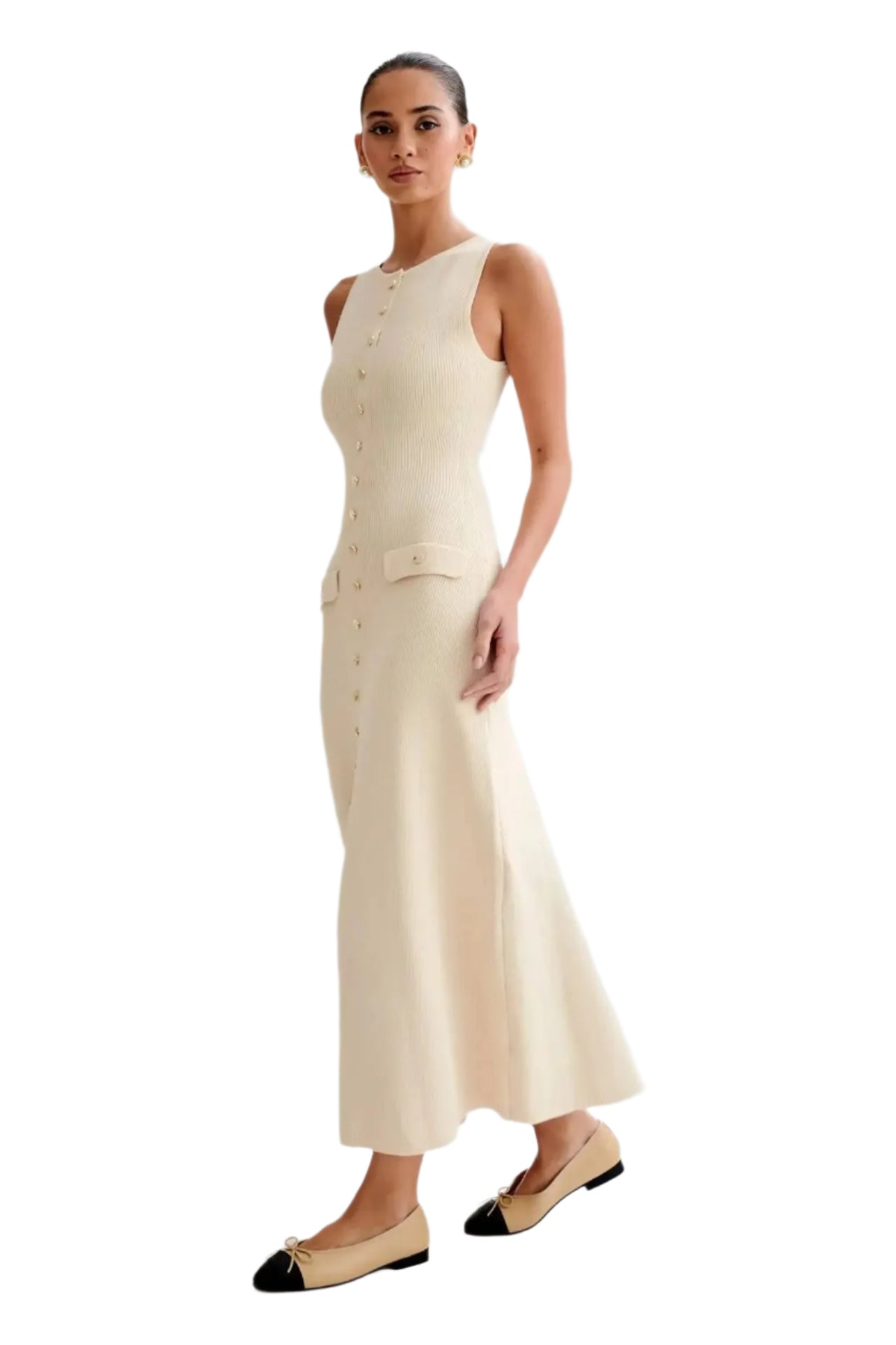 Deze mouwloze gebreide jurk heeft een enkelrijks knoopsluiting aan de voorkant en een slank, nauwsluitend silhouet voor een elegante, vrouwelijke look. De zachte stretchstof biedt comfort en vorm, terwijl de effen kleur de stijl veelzijdig maakt en gemakkelijk te combineren is met zowel elegante als casual outfits.