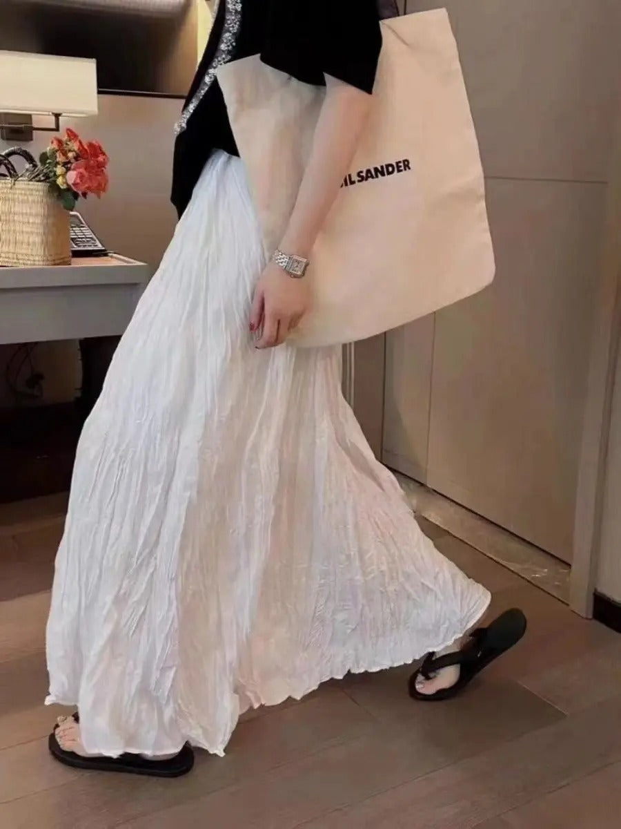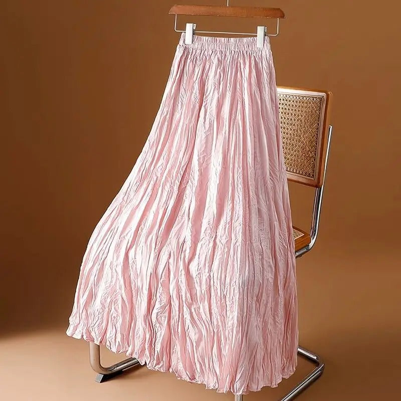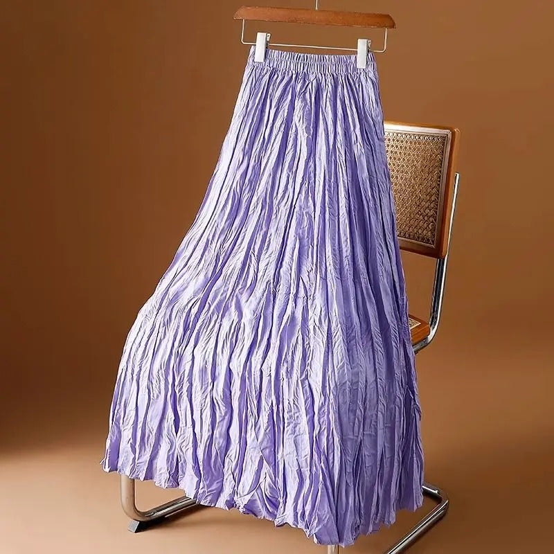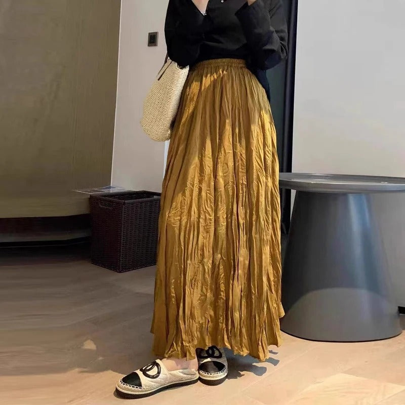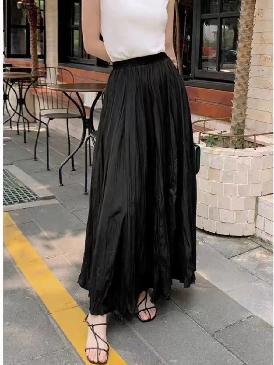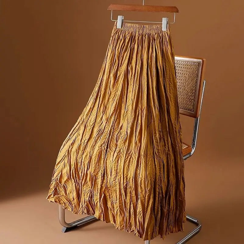 Deze geplooide satijnen rok combineert een vloeiend silhouet met een subtiele glans voor een gemakkelijke, verhoogde alledaagse look. Ontworpen met een hoge taille en lange lengte, biedt het comfort zonder stijl op te offeren. De plooien geven het een zachte textuur en beweging, perfect voor warmere dagen of luchtige avonden.